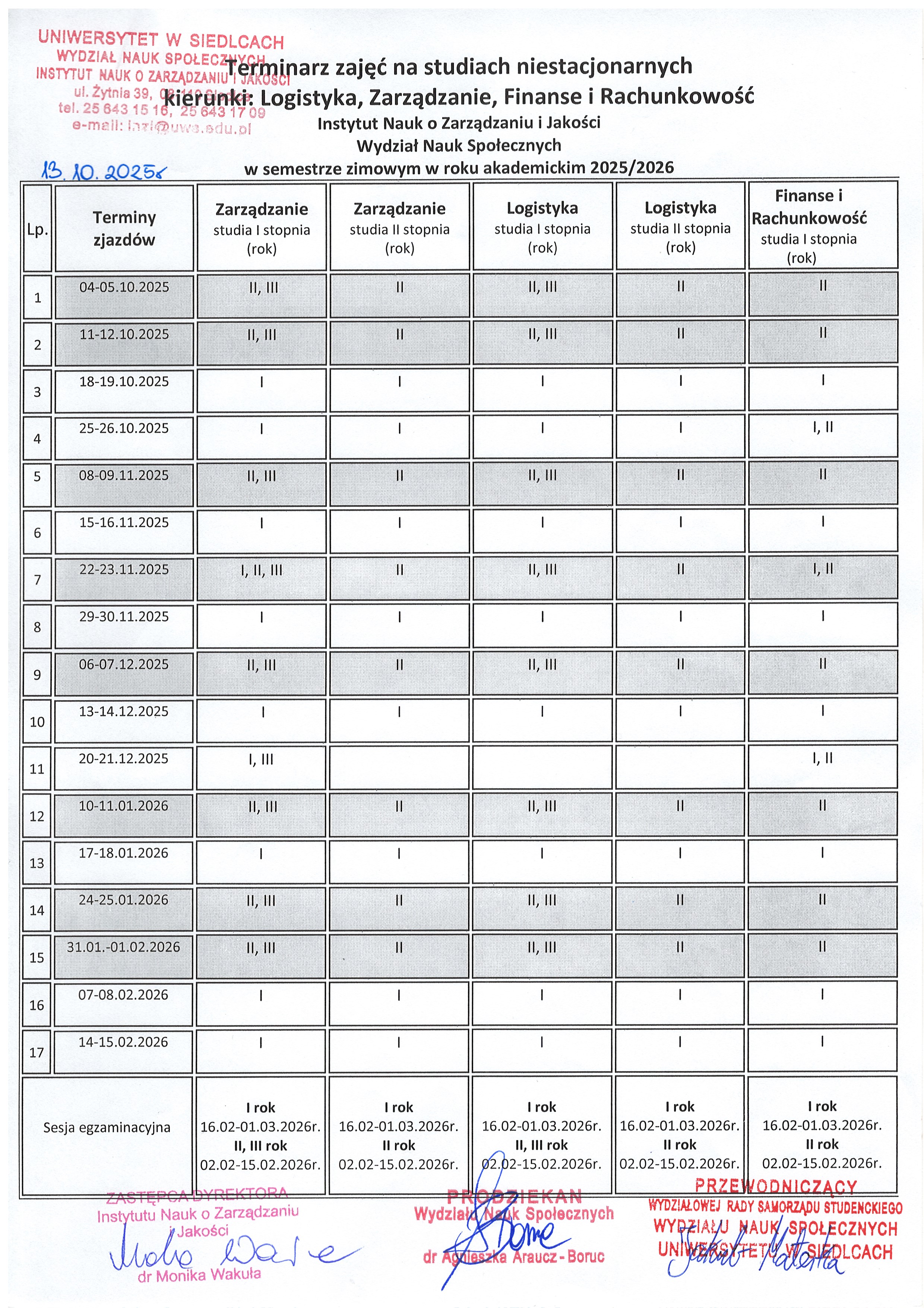 Studia niestacjonarne prowadzone w Instytucie Nauk o Zarządzaniu i Jakości w semestrze letnim i zmowym w roku akademickim 2025/2026 (link) -> Terminarz może ulec zmianie